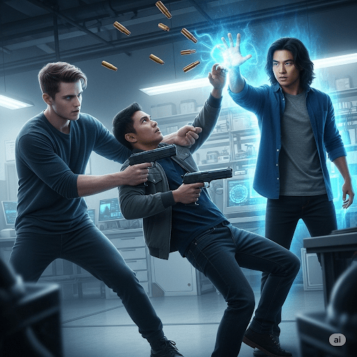 Erebus lunges forward with athletic precision – his swift grasp clasps Arin’s gun wrist tightly. Bullets spray wildly upwards, piercing the ceiling. As the two struggle intensely for control, SeventhSight’s eyes blaze bright blue, his raised hand faces Arin, palm outward – Arin’s body freezes, suspended mid-struggle by SeventhSight’s powerful telekinetic grip. He rises slowly off the ground, gun still clutched in his hand, now useless.