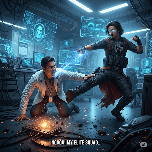 Arin’s expression twists in defiance, but his voice cracks slightly as he speaks. Arin spits at Erebus’ feet, “Malakar promised me power to overthrow YOU and Philippines rule alongside him!” Suddenly, lab doors burst open – Malakar’s elite troops pour in – 20 soldiers, armed to the teeth, surround SeventhSight and Erebus.