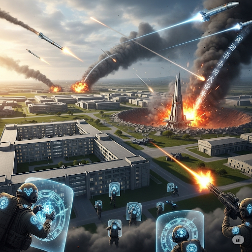 Missiles rain down, exploding into barracks and training fields. Panic erupts as soldiers scramble for cover or return fire with anti-aircraft guns. Thick smoke billows, obscuring the destruction – then briefly clears to reveal a massive crater where the command center once stood.