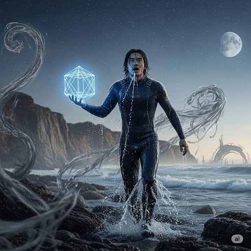 SeventhSight emerged from the depths of the ocean, the Tesseract secure in his grasp. He broke the surface, gasping for air as he stumbled onto dry land. His grey magic swirled around him, weakened but still alert. He looked up at the night sky, the stars twinkling above him.