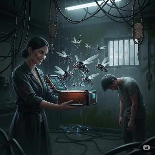 The woman smiled, her lips curling upward in a cold, cruel smile. “Death is too easy a punishment for you, Arin. You’ll tell us what we want to know, or you’ll wish for death.” She stepped back, her hand dropping to her side. A faint hum filled the air as a device materialized in her palm. It was a small, sleek box with a glowing blue core. The woman opened the box, revealing a swarm of tiny, mechanical insects. They buzzed angrily, their tiny wings beating rapidly as they hovered above the box.