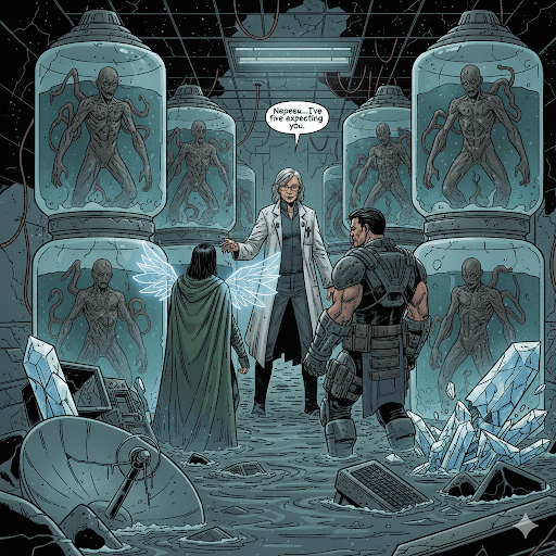 Deeper in Clark Base, they discovered a hidden lab – doors sealed, windows blacked out. Erebus blasted the doors open. Inside, rows of operating tables held failed experiments – twisted bodies barely resembling humans. SeventhSight gagged. Ereia whispered, “Carrionborn…they were trying to create an army.” A figure emerged from shadows: Dr. Elara Vex, Erebus’ aunt. “Nephew…I’ve been expecting you. Malakar hoped to present you with his gift: an army of Carrionborn, loyal only to you…and him, through the Order.”