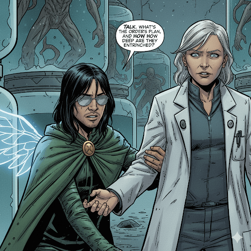 Erebus slams his aunt against the wall, enraged. “You twisted bitch,” Erebus growled, pinning her. “What did they promise you?” Dr. Vex smirked. “Immortality…and a seat beside the Order’s leaders when they reshape worlds.” SeventhSight interrupts, voice firm. “Erebus, we need to know what she knows about the Order’s plan.” Erebus shoves his aunt towards SeventhSight. “You ask. I’m done talking to her.”