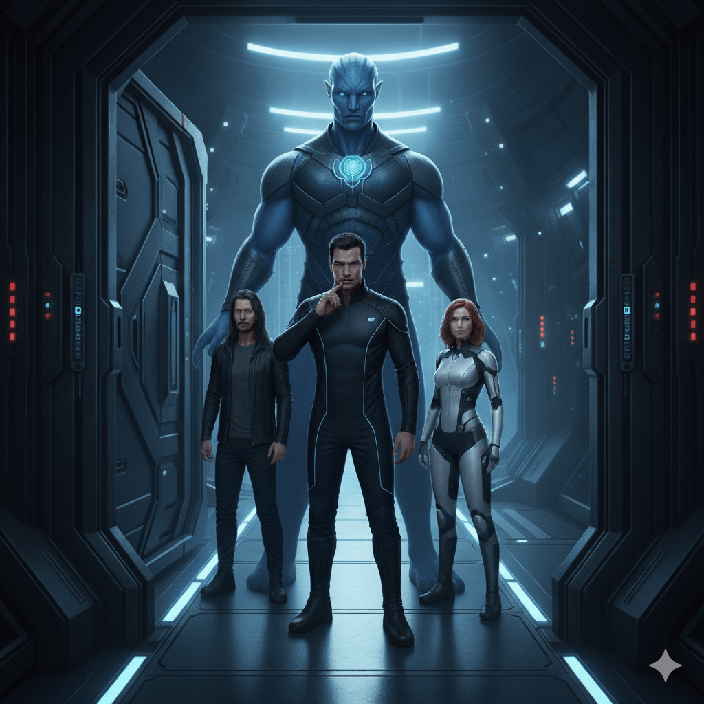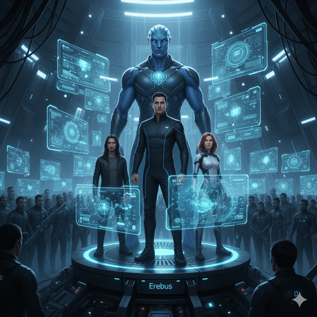Erebus stood tall on the elevated platform at the heart of Omicron Innovations, his chiseled figure bathed in the faint blue glow of holographic screens as he addressed his loyal followers. His deep voice echoed through the cavernous fortress, resonating off sleek metal surfaces and high-tech machinery. SeventhSight and Ereia stood beside him, their piercing eyes locked on the crowd as they scanned for signs of weakness. Kairos towered behind them, his broad shoulders squared and his hands clenched into fists, ready to unleash his formidable power.