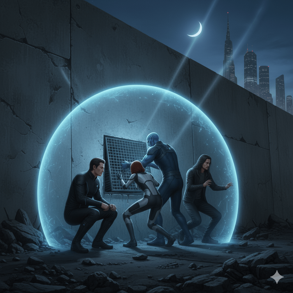 Kairos turned to Ereia, his voice low. “We need to get inside. Can you shield us from their cameras?” Ereia nodded, her eyes glowing softly as she activated her power. A shimmering barrier appeared around them, bending light and sound waves around their bodies. Kairos smiled grimly. “Let’s move.