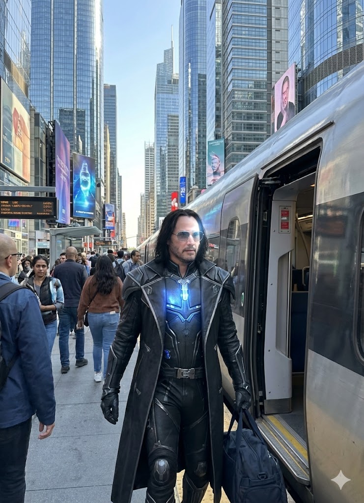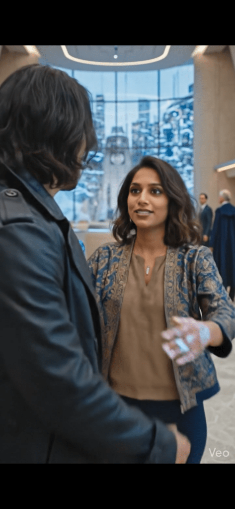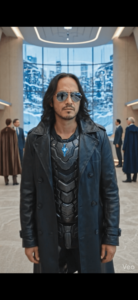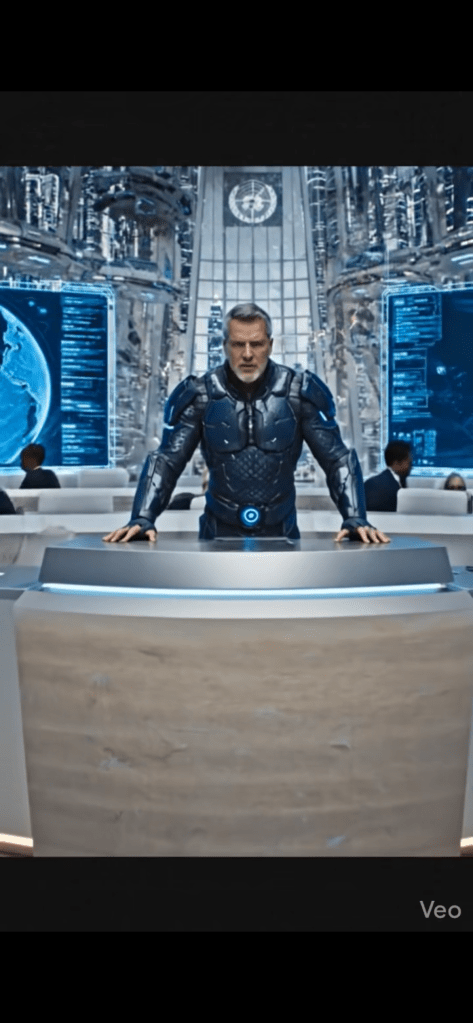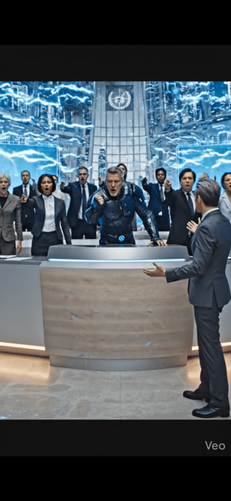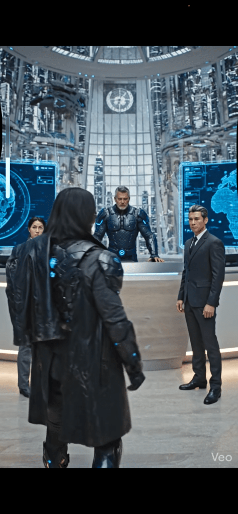 SeventhSight materialized at the New Eden teleportation checkpoint, a sleek glass structure on the outskirts of the city. After a brief security scan, he stepped out into the crisp Pacific air, taking in the towering skyscrapers of Aurora Heights. He walked to the nearby train station, boarded the Liberty Express, and rode the magnetized rails to the UN headquarters in Liberty District. The train’s AI, an androgynous voice, announced his arrival. SeventhSight stepped off the train and onto the bustling streets of Liberty District. The UN building loomed before him – a towering spire of glass and steel, emblazoned with the emblem of the United Nations. He entered the building, passed through security, and took the elevator to the top floor, where the meeting was being held.
