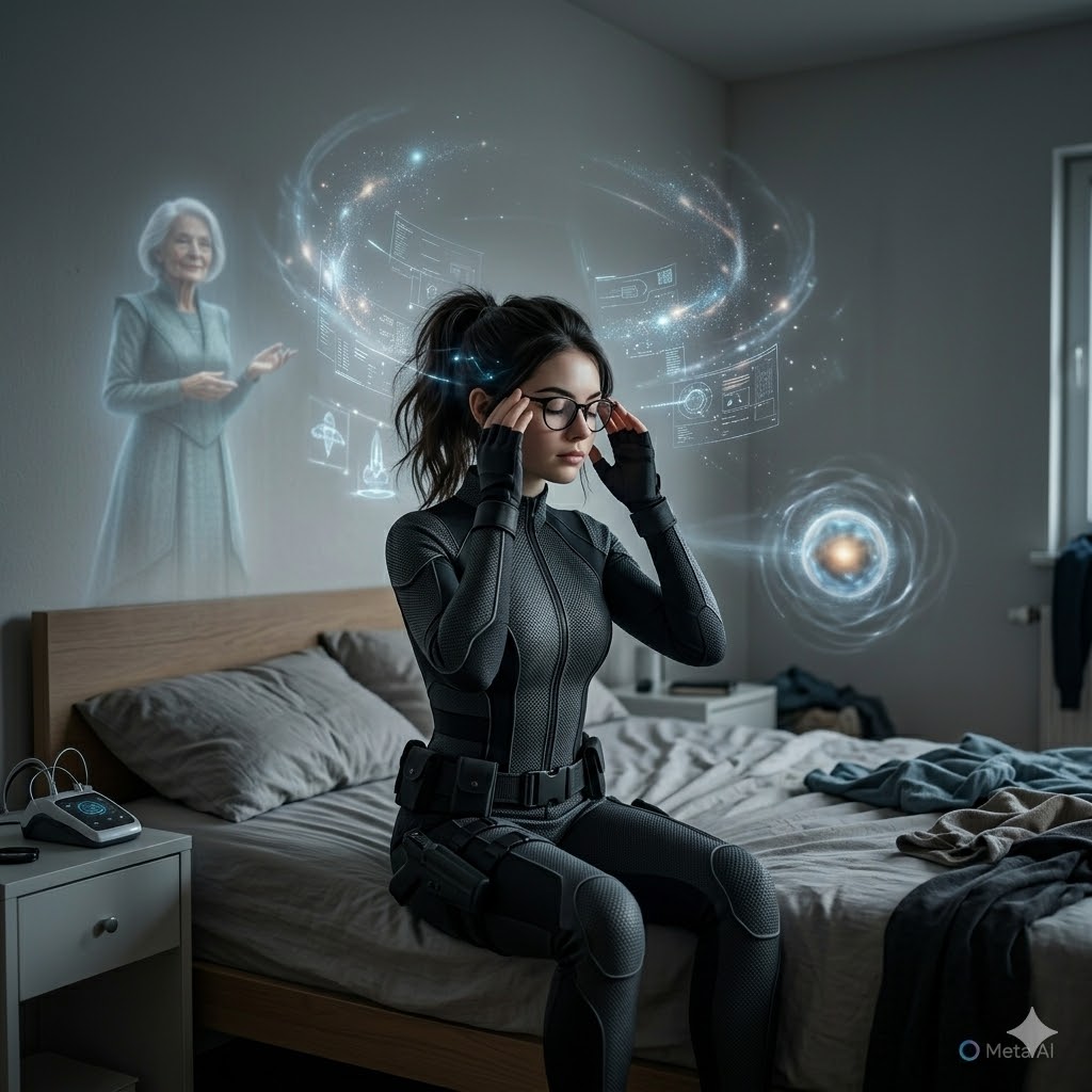 Thea sits comfortably on her bed, eyes closed, and breathes deeply. She focuses on Arkeia’s presence in her mind, feeling the neural link connect them.