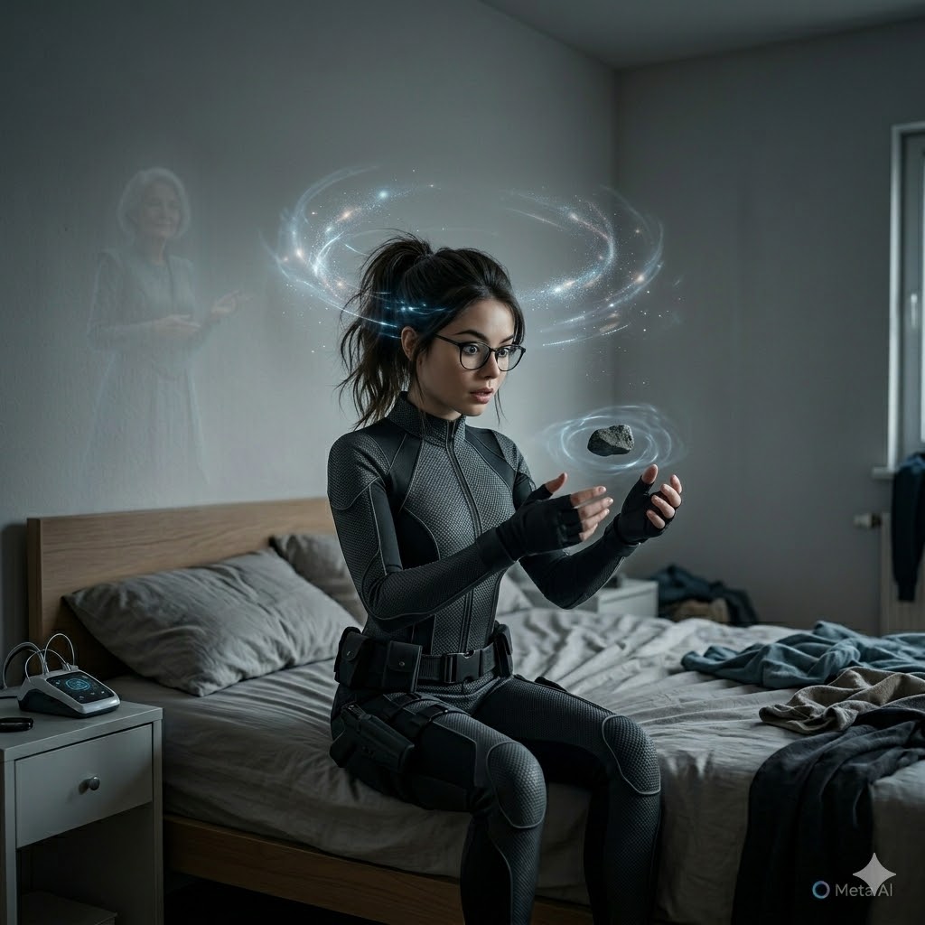 Thea looks down at her hands, focusing on a small rock on her nightstand. She thinks, “I want to lift that rock.”